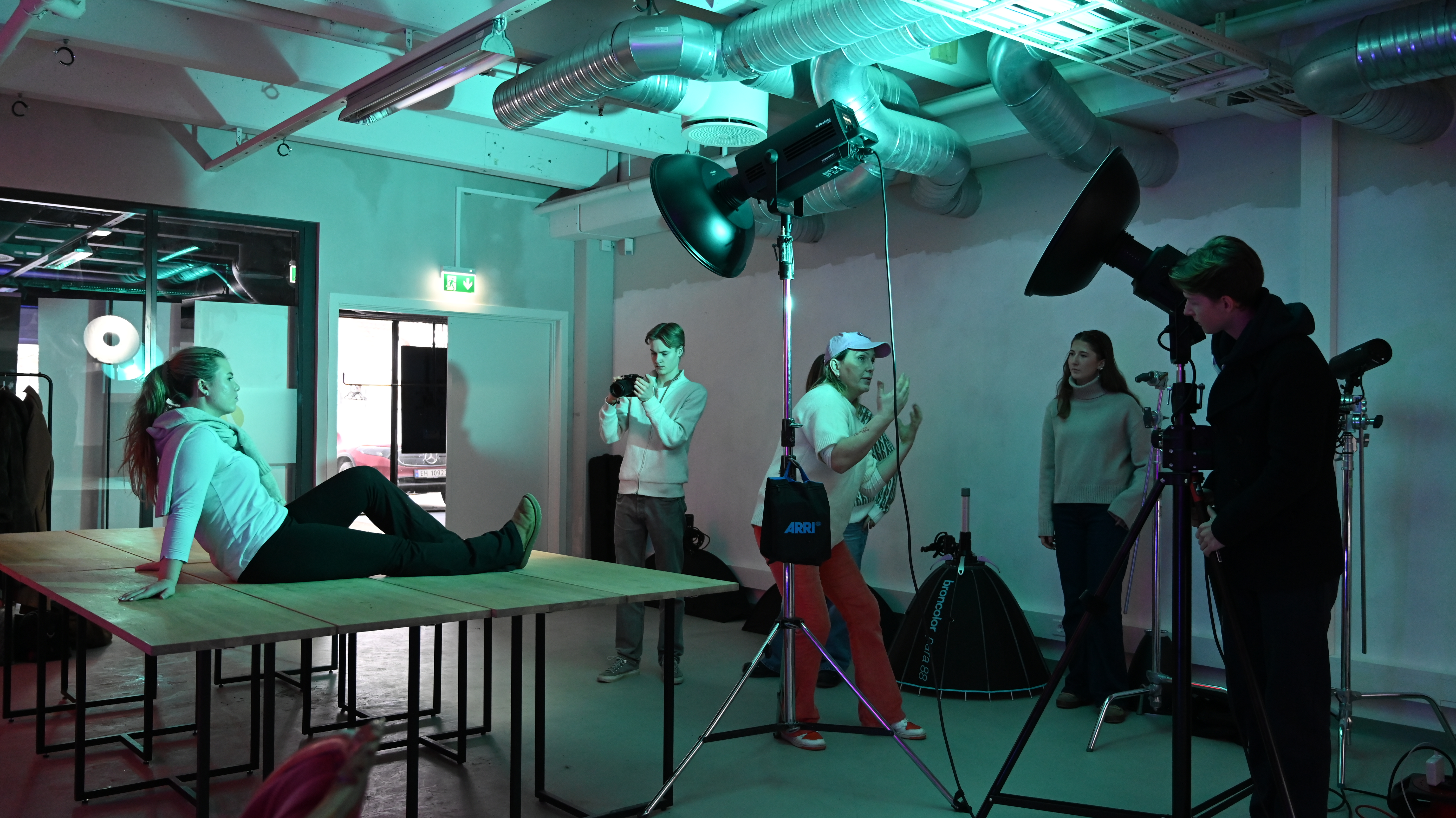 På fredager bruker elevene lokalene som studio. De får her blant annet praktisk opplæring og erfaring med lyssetting, bildeteknikk og mer. Denne dagen stiller Mie Svendsen Strand som modell.