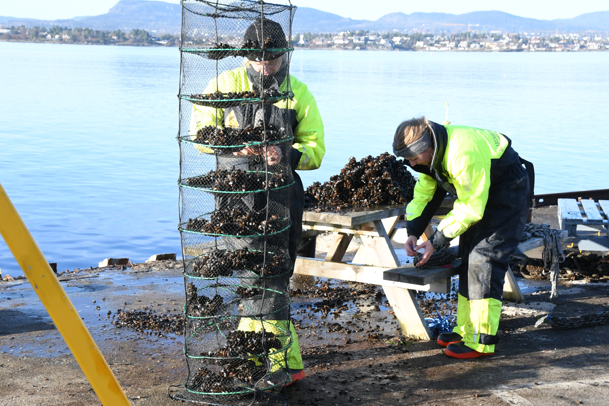 Fjordgartnerne løsner blåskjell fra steintauene og overfører de til egne strømper. Strømpene plasseres ut i anlegget, der skjellene kan vokse seg store. Ved å samle yngel hvert år, kan man etter 2-3 år høste fra anlegget hele året.