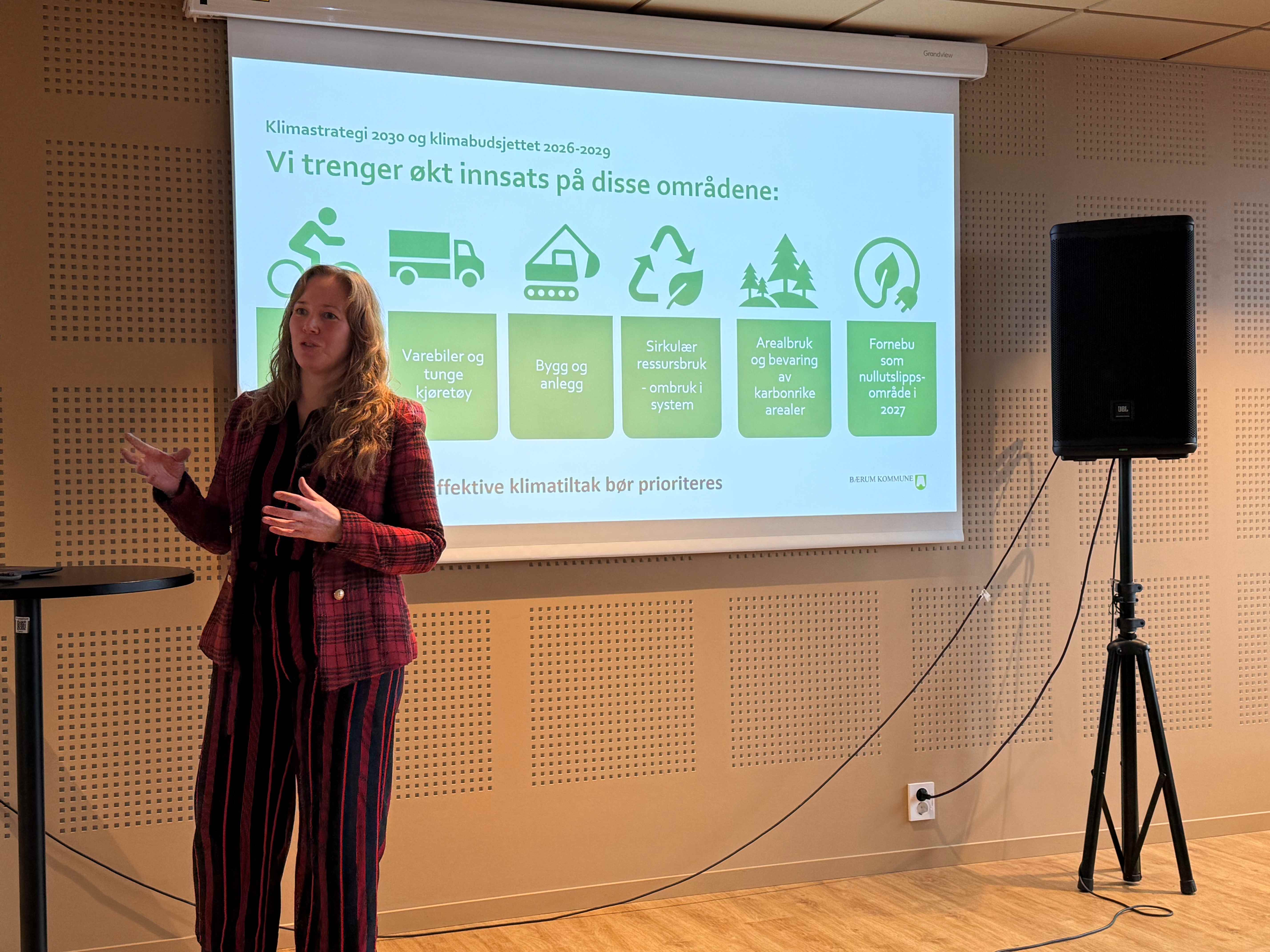 Kristin Molstad, leder av klimateamet i Bærum, fortalte om rammene for arbeidet med klimabudsjettet, og om finansieringsmuligheter for klimatiltak når kommunen samtidig skal spare penger.