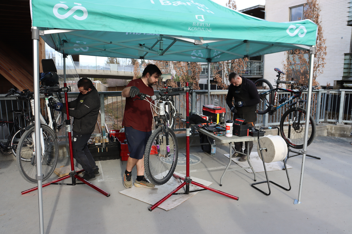 Julie var en av mange som møtte opp på Bekkestua for å fikse skavanker på sykkelen en torsdag i slutten av mars. På verkstedet fikk Julie luft i dekkene, justert girene, flyttet på en skjerm som går inn i hjulet, og hjelp til at sykkelen ikke lenger skrangler når hun sykler. I etterkant var hun fornøyd.