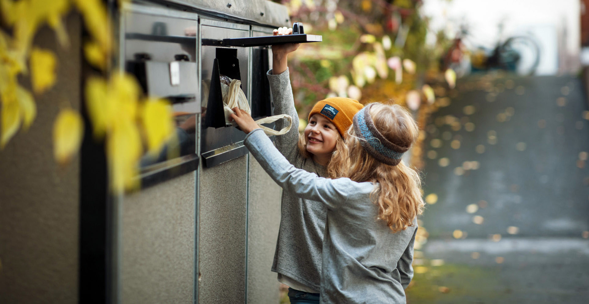 I hjemmet sorteres matavfallet i utlevert, grønn pose for matavfall og plasseres i utendørs beholder for matavfall.